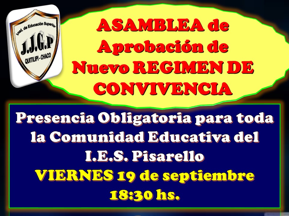 RÉGIMEN DE CONVIVENCIA ASAMBLEA DE APROBACIÓN 2025 Se convoca a TODOS los Estudiantes, Profesores y Personal Administrativo para revisar y aprobar esta herramienta legal, de suma importancia para el I.E.S. «J. J. G. PISARELLO» RÉGIMEN DE CONVIVENCIA Texto de Régimen de Convivencia aprobado —Versión FINAL Régimen de convivencia IES Pisarello (2025)